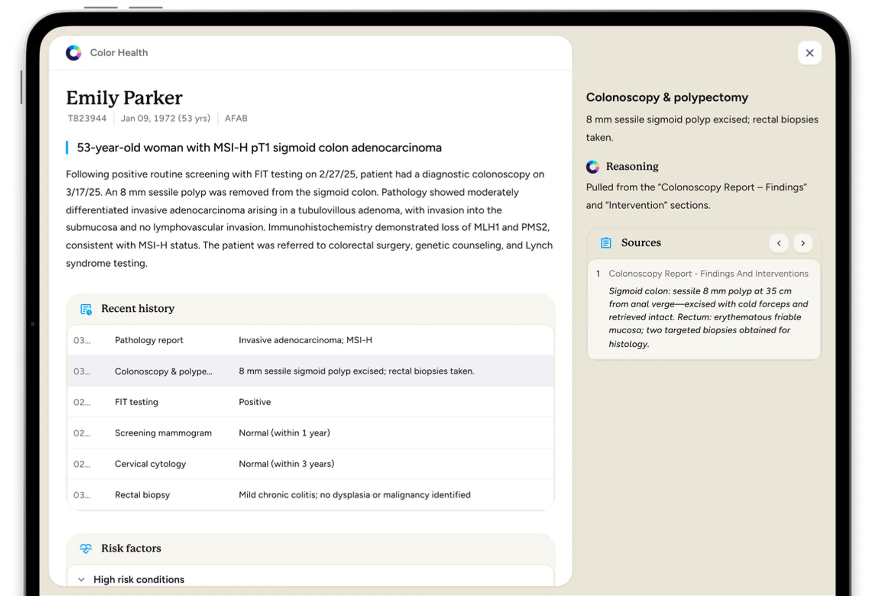 Read the blog Watch videoWhere speed matters in cancer care, so does accuracy and expertise. At Color, our AI initiatives are built to inform patient care directly – which means our clinicians drive all decision-making. AI helps them scale to serve more patients, broaden their expertise in and beyond their core domain field, and consider the holistic needs of patients in their decisions.